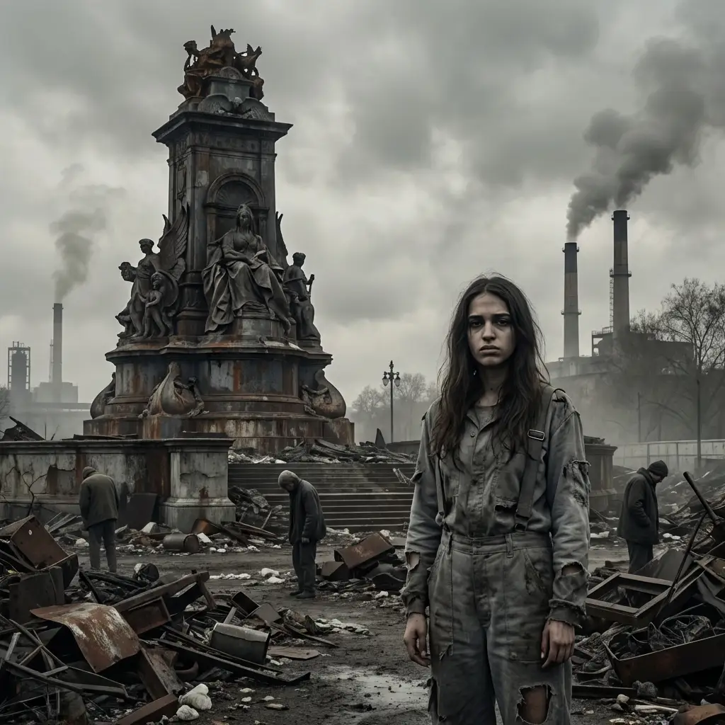 Industrial textures such as rusted metal, crumbling concrete, exposed wiring, and weathered surfaces are essential elements that communicate societal breakdown and resource scarcity. This prompt style works exceptionally well for concept art, speculative fiction illustrations, social commentary pieces, and worldbuilding for stories exploring themes of corporate control, climate catastrophe, or totalitarian futures.