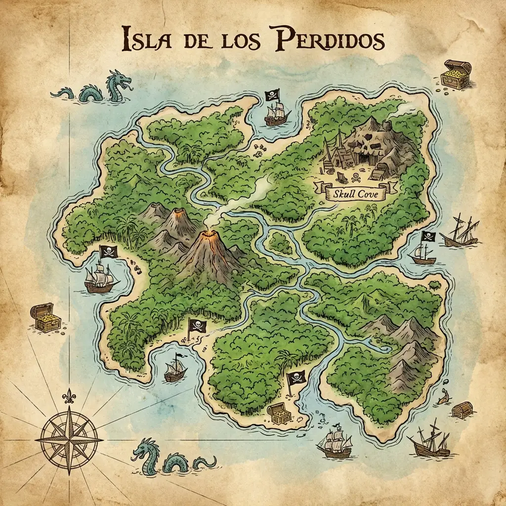 Fantasy island map in a tropical style, with lush jungles, hidden coves, and pirate hideouts.