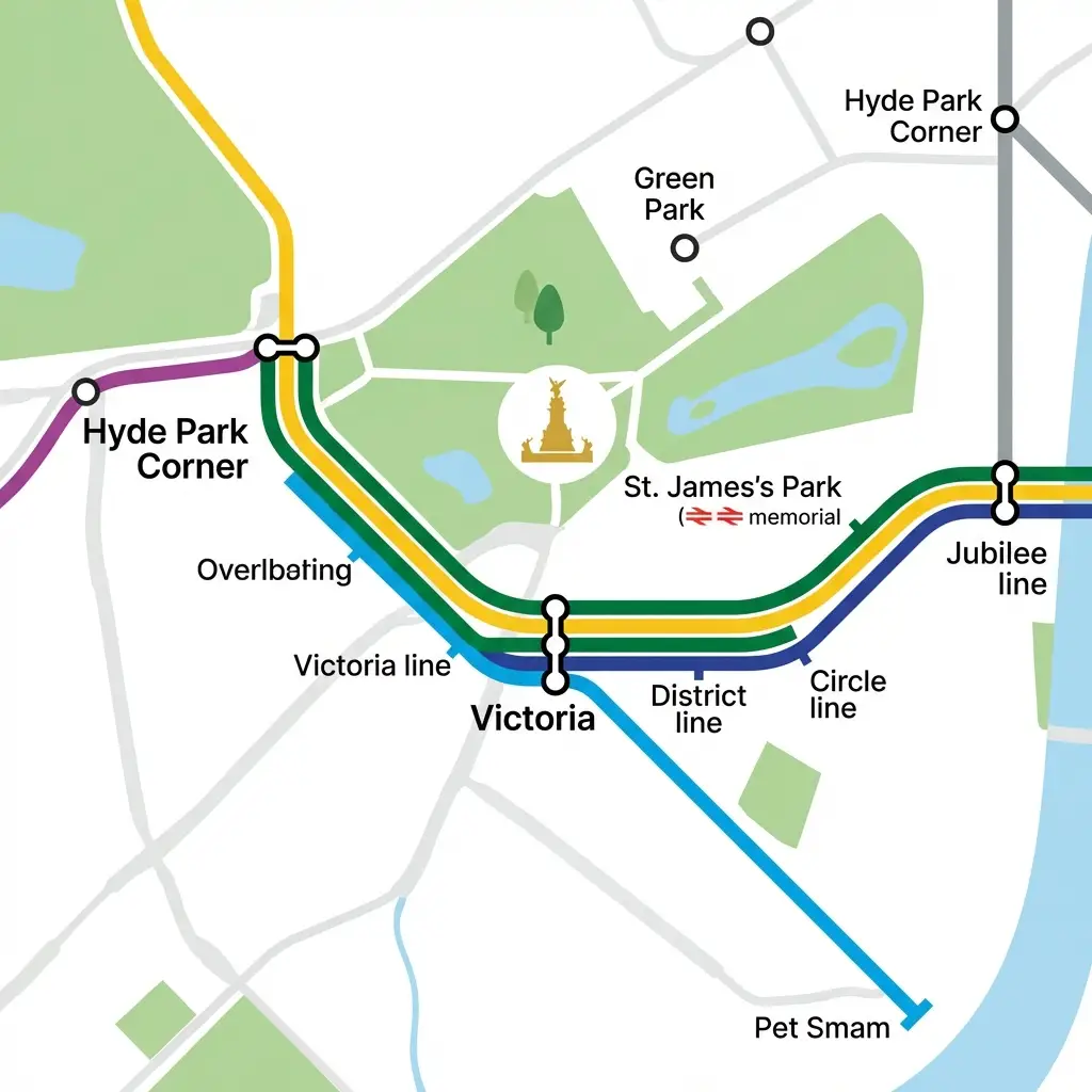 Modern subway map in a clean style, with clear lines, station names, and transit connections.