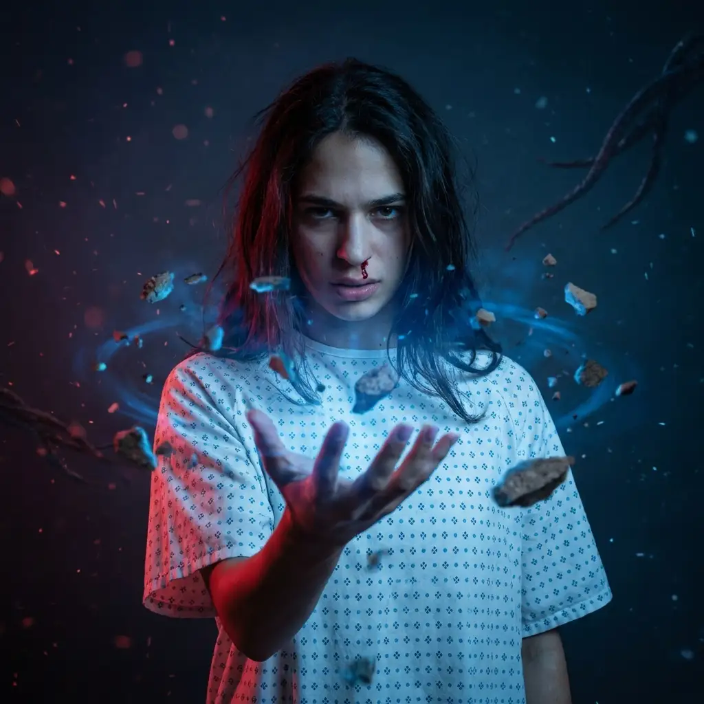 Reimagine the person as a fan-inspired version of Eleven. Recreate the iconic telekinetic power scene aesthetic. Intense focused expression. Dark atmospheric lighting with dramatic blue and red glows. Wearing a simple hospital-style gown. Floating particles and eerie Upside Down-style visual effects around the subject. Glowing energy effects. Nose bleeding. Objects floating and spinning around. Blue energy aura. Particles and debris levitating. Dark background. Supernatural VFX.