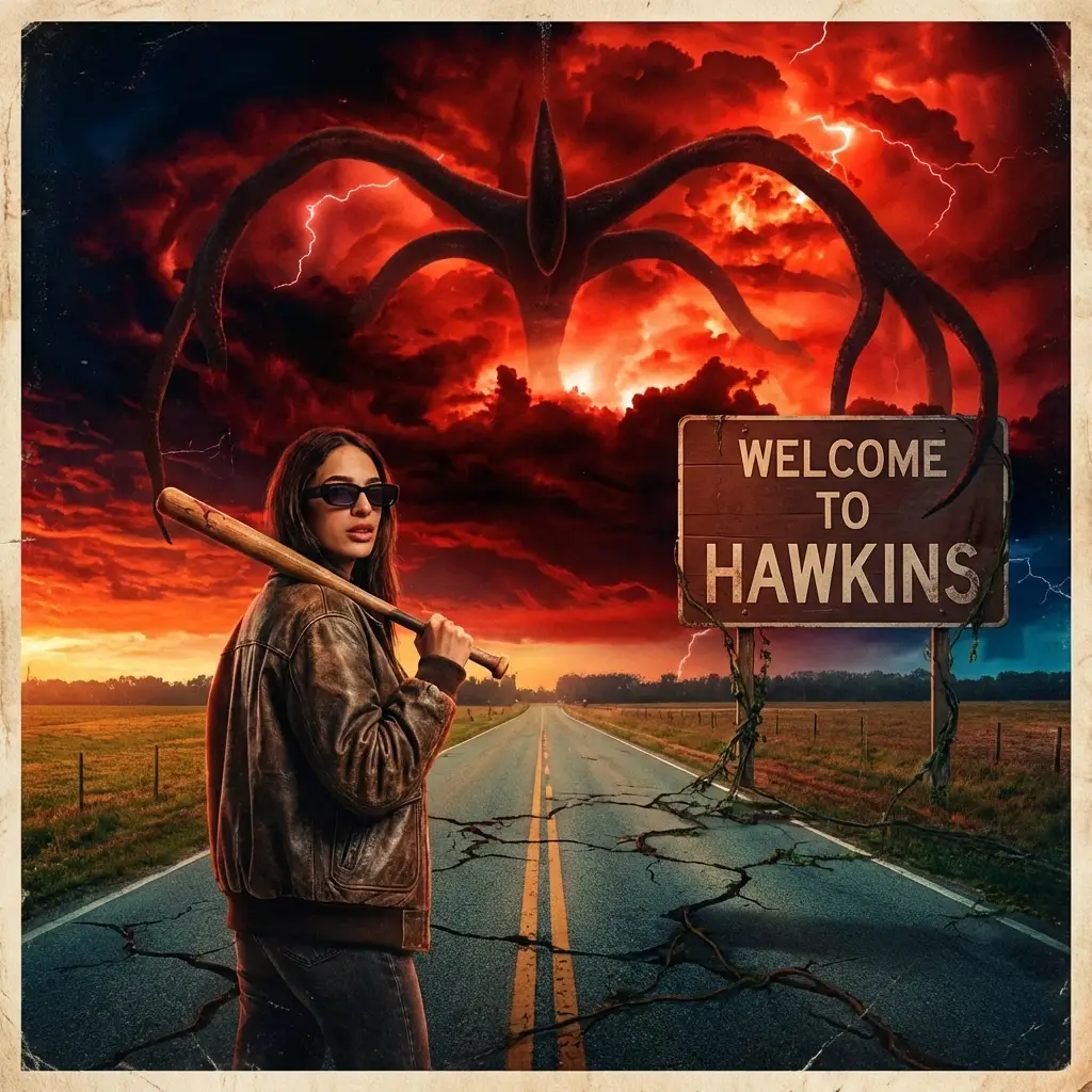Wide-angle poster shot featuring the person as a lone traveler on an empty highway facing a "WELCOME TO HAWKINS" sign. Above, the Mind Flayer (Shadow Monster) from Stranger Things looms from apocalyptic red-black storm clouds, tentacles reaching down. Person wears a bomber jacket and carries a bat. Red lightning, cracked pavement, 80s sci-fi horror movie poster style.